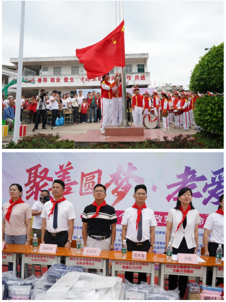 九點(diǎn)半,活動正式開始。操場中央,鮮紅的國旗成為最莊嚴(yán)的背景。隨著主持人洪亮而溫暖的開場,全場目光聚焦——這場充滿愛心力量的助學(xué)篇章,正式揭幕。