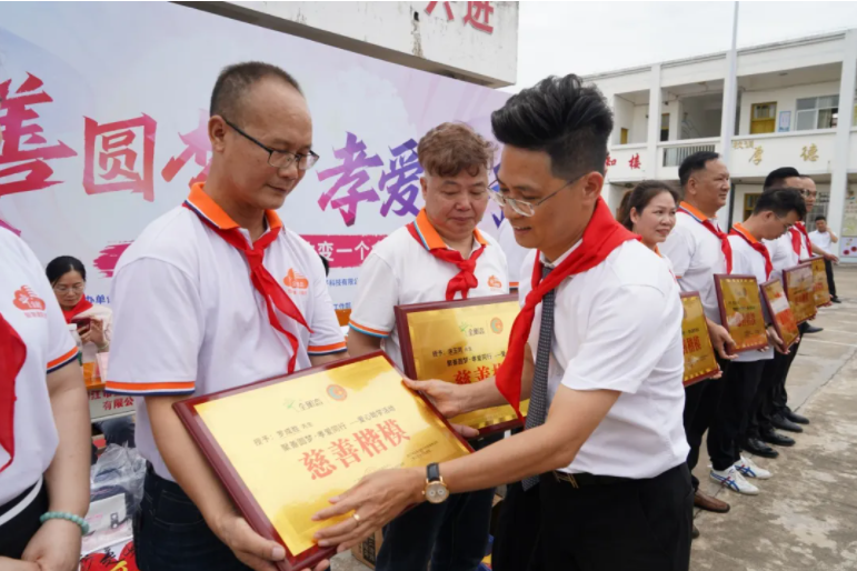 “愛心需要榜樣,善行值得褒揚(yáng)。”主持人話音落下,禮儀人員手捧九塊金光閃閃的“慈善楷模”榮譽(yù)牌匾上臺。在全場熱烈的掌聲中,莫里龍董事長親自為他們一一頒發(fā)牌匾。