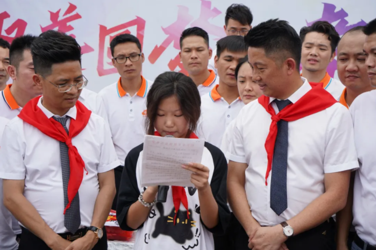 “紅領(lǐng)巾,是少先隊(duì)員的光榮標(biāo)志,更象征著希望與傳承。”在主持人的話語中,十余名優(yōu)秀的少先隊(duì)員代表邁著整齊的步伐走向第一排就坐的領(lǐng)導(dǎo)和嘉賓。他們踮起腳尖,認(rèn)真而莊重地為桂平市婦女聯(lián)合會李聰主席、共青團(tuán)桂平市委員會林楚亭副書記、全衡態(tài)莫里龍董事長、楊柏茂總經(jīng)理等佩戴上鮮艷的紅領(lǐng)巾。