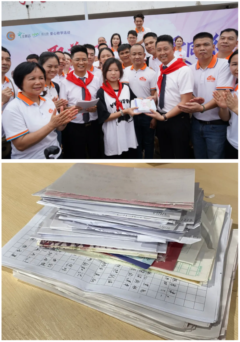 全衡態(tài)楊柏茂總經(jīng)理把象征希望的助學(xué)金信封鄭重地一一遞交給莫董和九位愛心人士代表。緊接著,這十位愛的使者俯下身,將助學(xué)金親手交到對應(yīng)的十位受助學(xué)生手中。