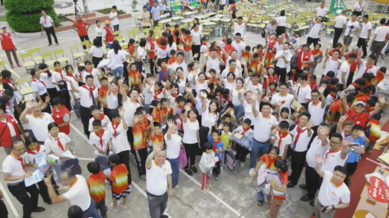 無人機(jī)緩緩升空,航拍下這壯觀而感人的一幕。全衡態(tài)的員工和愛心人士們與孩子們站在一起,向著空中的鏡頭開心地?fù)]手。地面上,攝影師穿梭其中,捕捉著一張張洋溢著幸福與感恩的特寫笑臉。